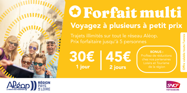 Les vacances en Pays de Loire avec un forfait multi en poche, c’est rigolo, c’est écolo, et c’est surtout d’infinies découvertes à faire en famille ou entre amis. A ce prix-là, on ne réfléchit pas trop, on prépare juste un peu son itinéraire et on prend les billets par ici. Un maillot et un pique-nique dans le sac à dos et Allez hop ! En route avec Aléop !